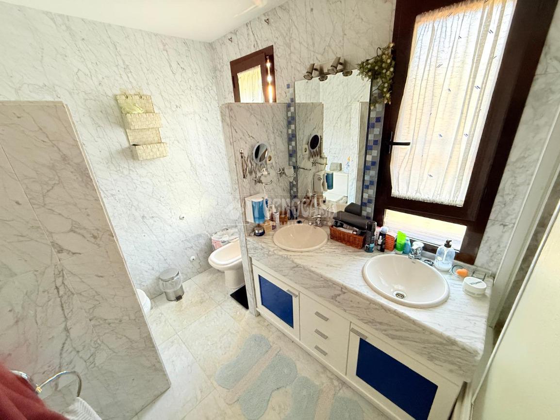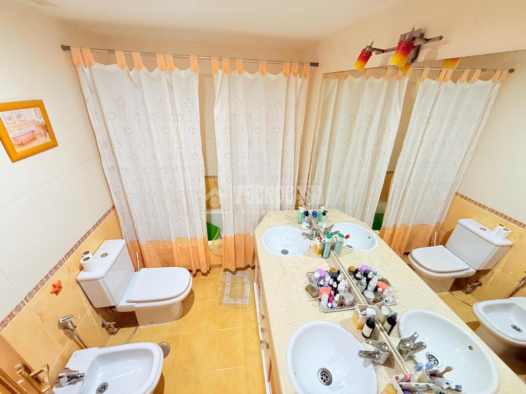 Los baños destacan por su amplitud, contando con ventanas que permiten la entrada de luz natural y doble lavabo para mayor comodidad. El aire acondicionado instalado en toda la casa asegura un ambiente agradable durante todo el año. En el sótano, una práctica sala de lavandería y una despensa ofrecen espacio adicional para el almacenamiento y la organización del hogar.